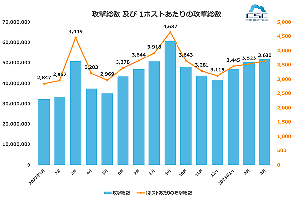 2023年1月1日~3月31日において同社が検知した、Webアプリケーションへのサイバー攻撃の総数は1億4,863万1,502件。1ホストあたりでは1万0,598件で、微増傾向となっている。