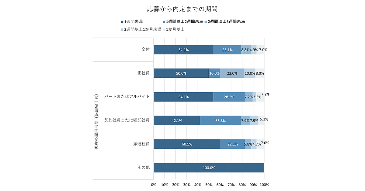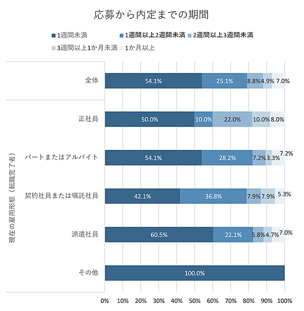 現在の雇用形態別にみると、派遣社員ほど採用が迅速で、「1週間未満」での決定が60.5%に達している。パートまたはアルバイト54.1%がそれに続く。