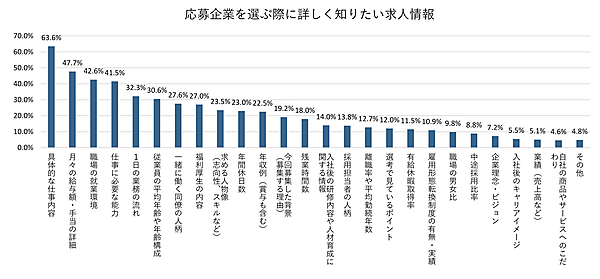 次に「応募企業を選ぶ際に詳しく知りたい求人情報」を聞くと、「具体的な仕事内容」63.6%が最多で、「月々の給与額・手当の詳細」47.7%、「職場の就業環境」42.6%、「仕事に必要な能力」41.5%が、いずれも4割台で並ぶ。求人する企業側の参考になるだろう。