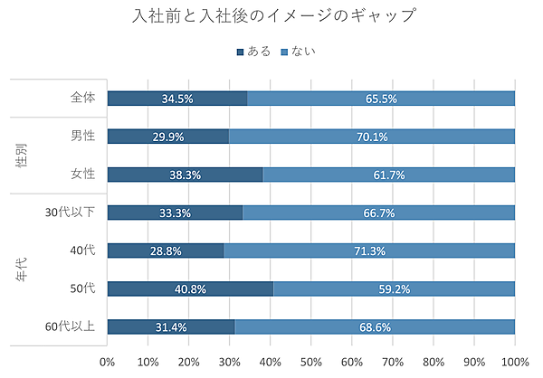 さらに「求人情報や入社前の説明から感じたイメージと、入社後のイメージにギャップがあったか」を聞くと、全体では「ある」が34.5%。性別では男性が29.9%、女性が38.3%と、女性のほうが男性より高い。年代別では50代40.8%が特に高い。