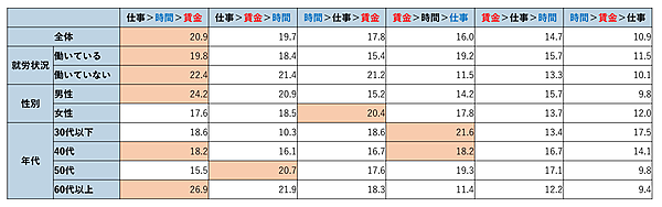 性別では、男性は「仕事>時間>賃金」24.2%が最多だが、女性は「時間>仕事>賃金」20.4%だった。年代別だと、30代以下は「賃金>時間>仕事」21.6%が多いが、40代は「仕事>時間>賃金」「賃金>時間>仕事」が同率18.2%となった。「仕事」を優先順位の1位にしている割合は、30代以下は28.9%、40代は34.3%、50代は36.2%、60代以上は48.8%で、年代が上がるほど「仕事」を重視している。