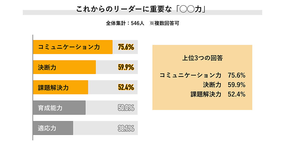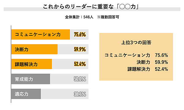 まず「目標にしたいリーダーがいるか」を聞くと、全体の50.0%が「いる」と回答。若い世代ほどいるの比率が高かった。そこで「これからのリーダーに重要なのは何の力か?」を聞くと、「コミュニケーション力」75.6%が特に多く、「決断力」59.9%、「課題解決力」52.4%がそれに続いた。