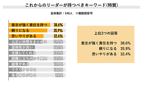一方で「これからのリーダーが持つべきキーワード(資質やスキル)」を聞くと、「強い意志と責任感」38.6%、「頼りになる」35.9%、「思いやりがある」32.4%がトップ3だった。