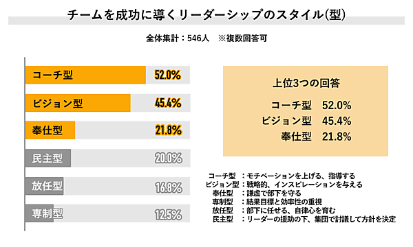 また「チームを成功に導くリーダーシップのスタイル」を聞くと、「コーチ型」52.0%、「ビジョン型」45.4%、「奉仕型」21.8%が上位だった。コーチ型の特徴としては、協力的、指示を出さず導く、成長の手段として学習を重視するといったポイントが上がっているが、残る2タイプもメンバーの成長に協力的だといえる。