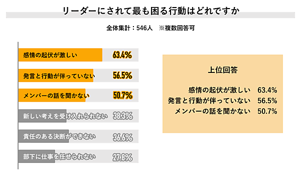一方で「リーダーにされて困る行動」としては、「感情の起伏が激しい」63.4%が最多で、「発言と行動がともなっていない」56.5%、「メンバーの話を聞かない」50.7%が続いた。