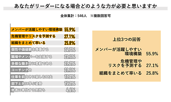 なお「もし自分がリーダーになった場合、どのような力を必要とするか」を聞くと、「メンバーが活動しやすい環境構築」55.9%が特に多く、「危機管理やリスクを予測する」27.1%、「組織をまとめて率いる」25.8%の倍以上となった。