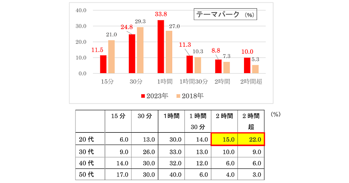 「1時間」33.8%、「30分」24.8%、「15分」11.5%が上位で、計7割を占める。2018年調査と比べ「15分」「30分」が減り、「1時間」以上の各時間が増えた。 特に年代別で20代は「2時間」15.0%、「2時間超」22.0%と他世代よりノンビリだ。