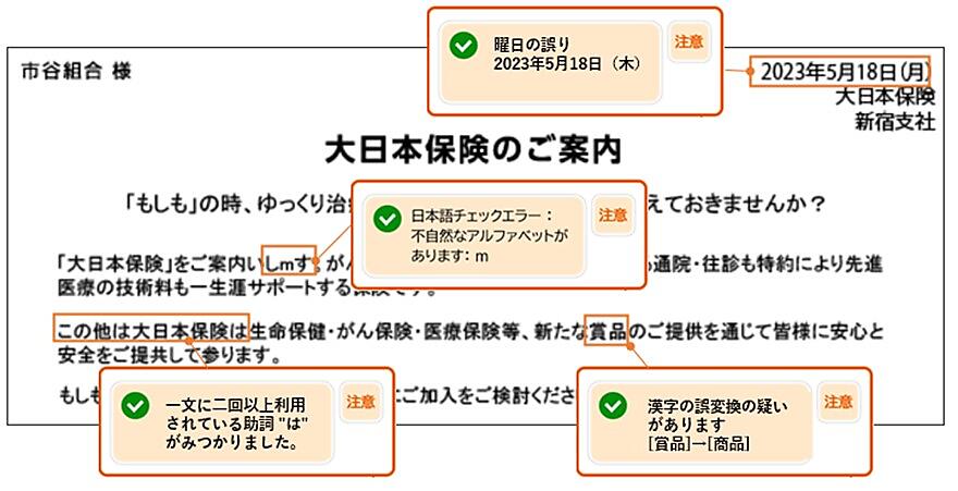大日本印刷(DNP)は、AI(人工知能)を活用して製品のパッケージや広告物、契約書などの校正・校閲・審査業務の省力化を支援する「DNP AI審査サービス(校正・回覧業務)」に、「日本語の誤用などのチェック」、「表組みの校正・校閲チェック」、「多言語対応」の新機能を追加して提供を始めた、と6月22日に発表した。新機能の実装でサービス提供する業界を拡大し、校正・校閲・審査業務のDX(デジタル変革)を推進する。
