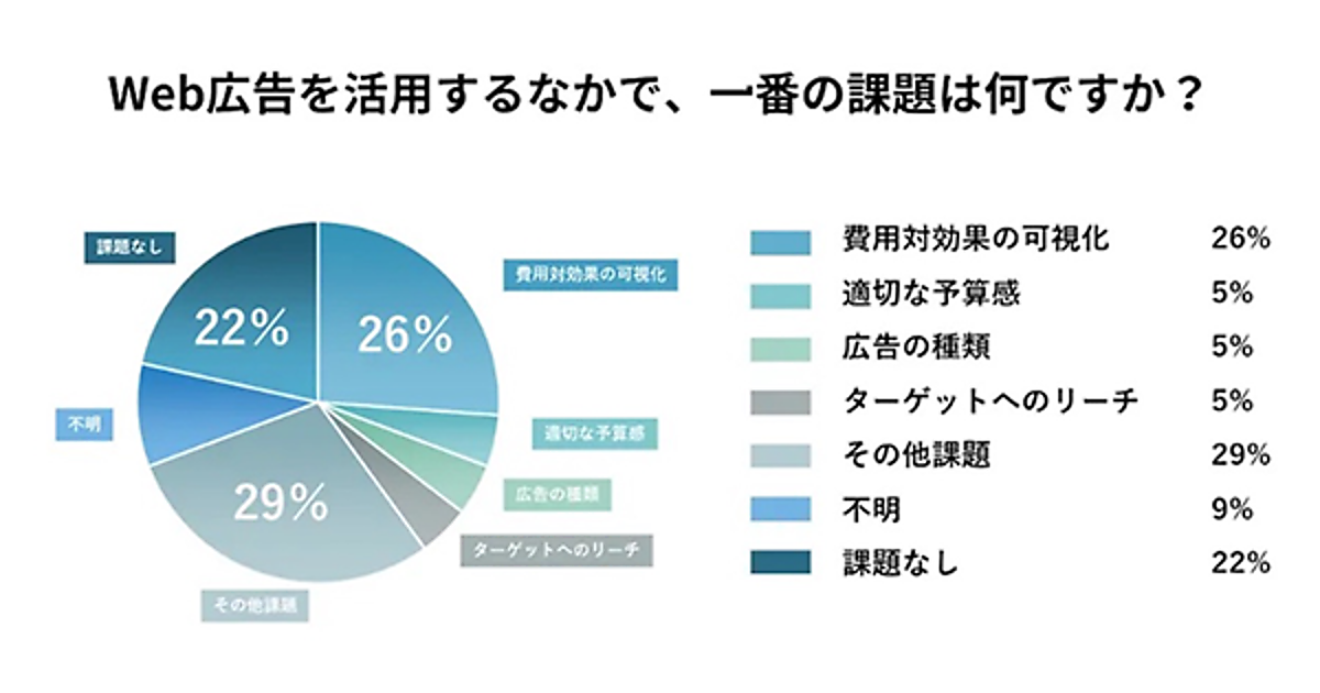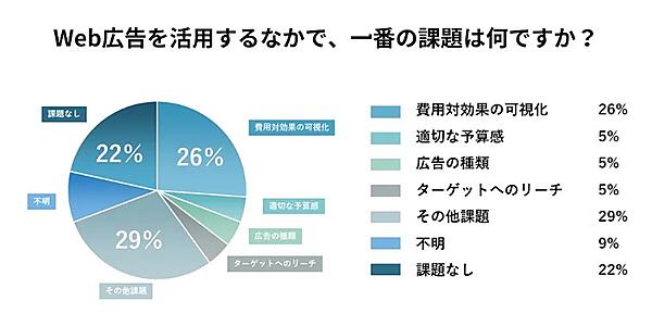意見が多かった課題では「費用対効果の可視化」が特に多く26%。以下「適切な予算感」「広告の種類」「ターゲットへのリーチ」各5%が続く。やはりコスパへの意識が強く、計測可能なWeb広告では、そのあたりのデータが求められるようだ。