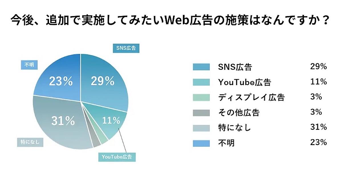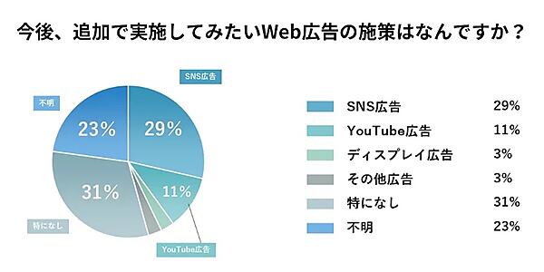 「すでに実施しているWeb広告の施策に加え、今後実施したい施策」を聞くととしては、「SNS広告」29%が特に多く、「YouTube広告」11%、「ディスプレイ広告」3%が続いた。ただし「特になし」が31%と最多ボリュームを占める。やはりアナログ手法よりデジタル手法が優勢のようだ。
