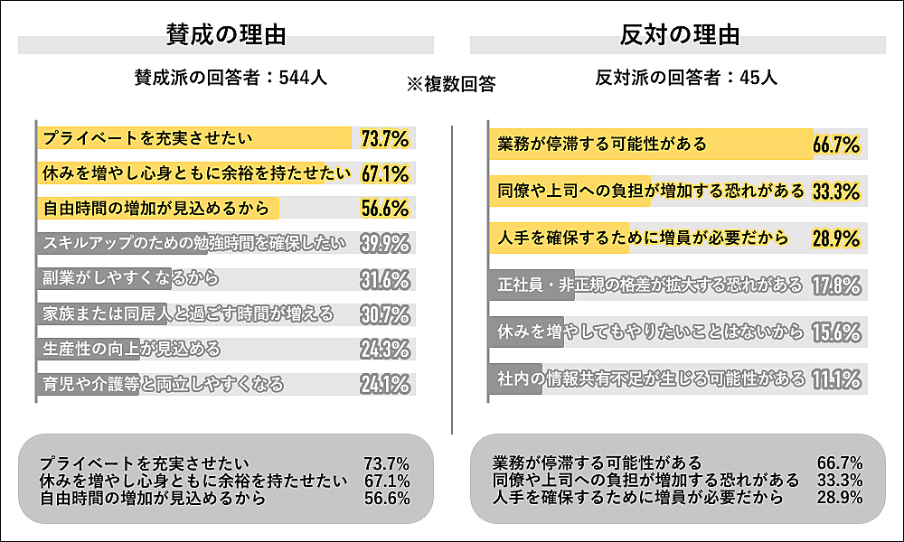 週休3日制への賛否の理由(無条件の場合)を聞くと、賛成では「プライベートを充実させたいから」73.7%「休みを増やして心身ともに余裕を持たせたいから」67.1%、「自由時間の増加が見込めるから」56.6が上位。反対の理由を聞くと「業務が停滞する可能性があるから」66.7%、「同僚や上司への負担が増加する恐れがあるから」33.3%、「人手を確保するために増員が必要になるから」28.9%が上位だった。