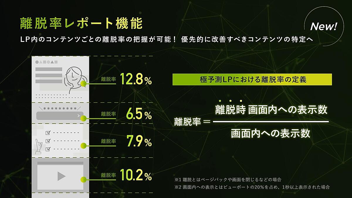 新たな離脱率レポート機能では、CVR効果予測を行いながら制作したLPを配信し、訪れたエンドユーザーの行動ログを蓄積して専用のレポート画面に表示することで、LPを構成するコンポーネントごとの離脱率を把握できる。より効果的な運用に重要となる改善箇所や優先順位の判断に役立ち、高い効果を継続的に出す運用を強化できる。