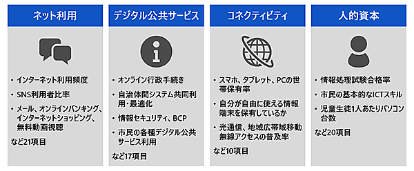 DCIは、「(1)市民のネット利用」「(2)デジタル公共サービス」「(3)コネクティビティ(端末、通信インフラ)」「(4)人的資本(デジタルスキルの保有度やICT教育)」の4区分、70弱の項目から構成され、最終的なスコアは0~100で示される。