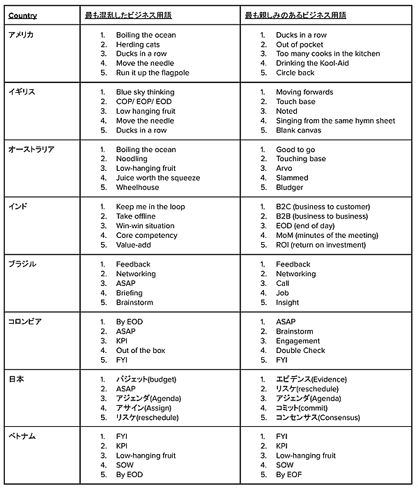 「もっとも混乱するビジネス用語」「もっとも親しみのあるビジネス用語」について具体的なフレーズを聞くと、いずれの国でも英語の専門用語が上位。これについてDuolingoは「ビジネスのグローバル化」と「若い世代の社会人が、英語の専門用語をその国の言語に直接翻訳せずに職場に持ち込んでいること」を理由にあげている。