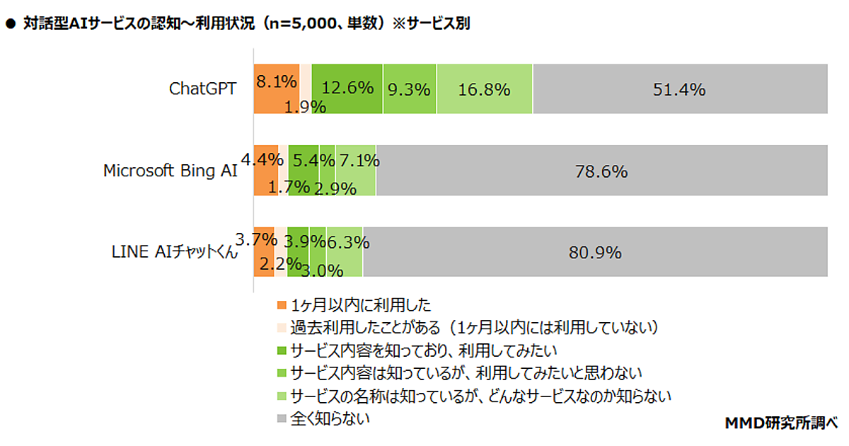 MMDLabo株式会社が運営するMMD研究所は、「ChatGPTなどの対話型AI」に関する調査結果を発表した。15歳~69歳の男女5,000人が回答している。