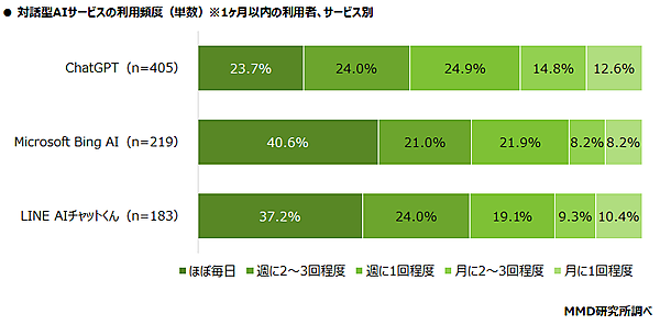 一方「利用頻度」について聞くと、この1か月以内に「ほぼ毎日」とした人は、「ChatGPT」23.7%、「Microsoft BING AI」40.6%、「LINE AIチャットくん」37.2%と、ChatGPTは低い。サイトにアクセスする必要のあるChatGPTに対し、検索サービスやコミュニケーションサービスから地続きで利用できるMicrosoft BING AI、LINE AIチャットくんのほうが、フロントエンドの違いで敷居が低いためだろう。