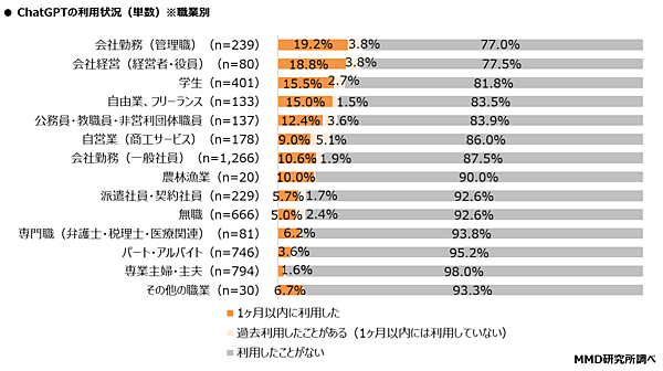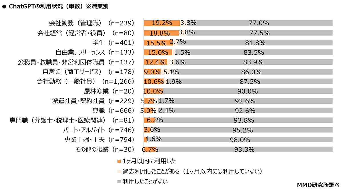 最も利用経験者の多かったChatGPTについて、職業別で利用経験を見ると、「会社勤務-管理職」23.0%がもっとも多く、以下「会社経営-経営者・役員」22.6%、「学生」18.2%が上位だった。業務利用より、単純に興味で“試したみた”という立場の人が多いようだ。
