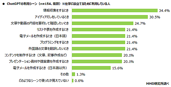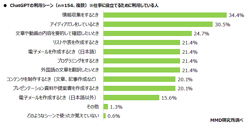 これら154人に、「仕事のどのようなシーンで利用しているか」を聞くと、「情報収集をするとき」34.4%、「アイデアだしをしているとき」30.5%、「文章や動画の内容を要約して確認したいとき」24.7%が上位だった。