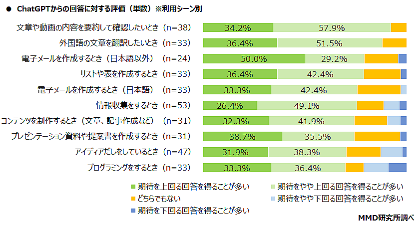 さらに「シーン別に期待した回答が得られたか」(上回った+やや上回ったの合計)を聞くと、「文章や動画の内容を要約して確認したいとき」92.1%に、もっとも期待を上回る回答を得ていることが判明した。その他では「外国語の文章を翻訳したいとき」87.9%、「電子メールを作成するとき(日本語以外)」79.2%が上位だった。