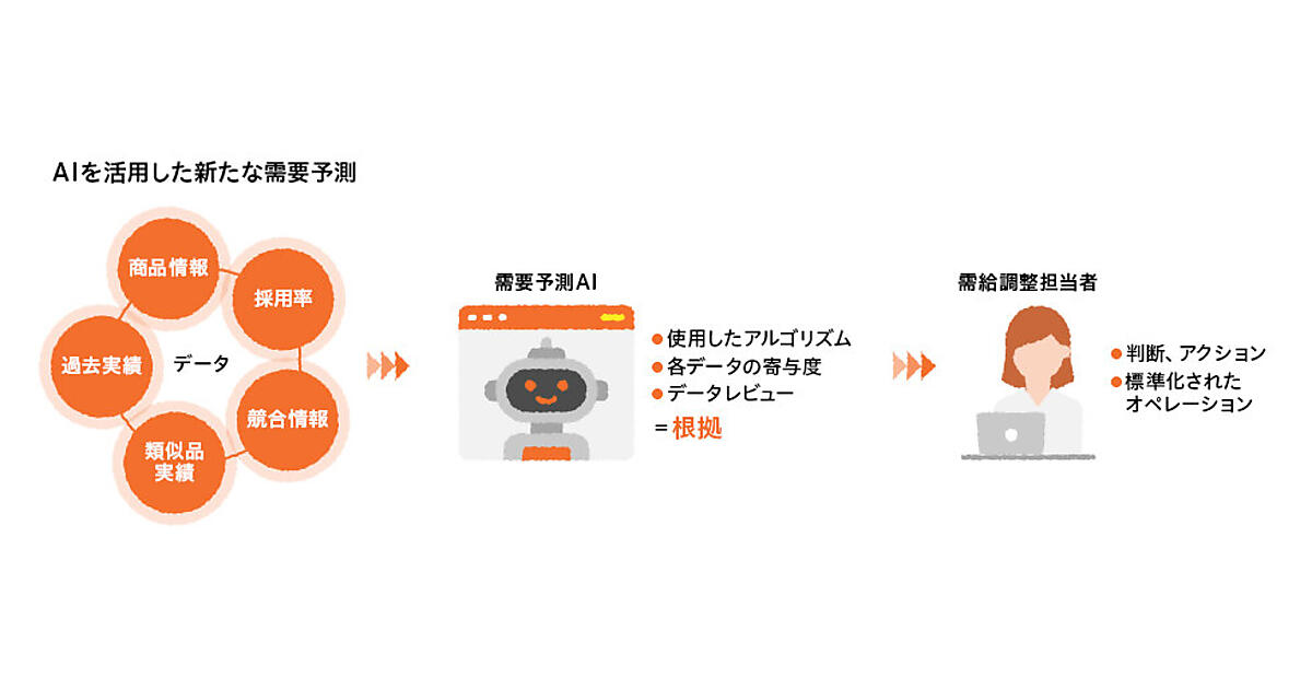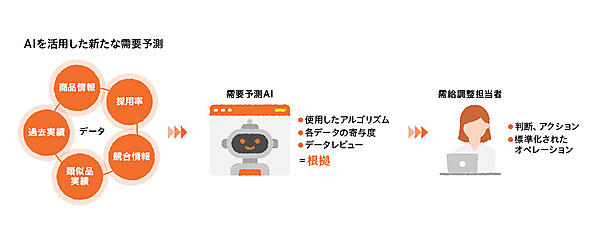 担当者の経験に依存することが多く技能伝承に課題があったため、AI需要予測システムを導入した。2022年10月にデータ分析・試験モデルの作成を始め、2023年3月までの6カ月間、約40商品でAIの機能を検証。当初は人の予測精度の方が高かったものの、AIが学習を重ねた結果、人だけより人とAIが協働した予測精度は約20%上昇した。