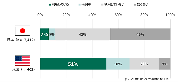 まず「ビジネスにおけるChatGPT利用」を聞くと、日本は「利用している」7%、「検討中」5%と合わせても1割程度にとどまった。「知らない」46%と知名度自体がまだまだ低い。一方米国は「利用している」51%、「検討中」18%で、すでに実用的なツールとなっている。「知らない」は9%と1割未満だ。