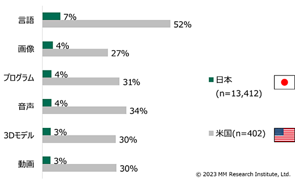 ChatGPTは文章生成型AIだが、その他にも、画像生成型の「Stable Diffusion」「DALL・E」といったAIも注目を集めている。これらタイプ別で利用率を見ても、だいたい7~10倍の差が日米で見られる。この理由についてMM総研では、経営層の関心が米国では高い点を指摘している。