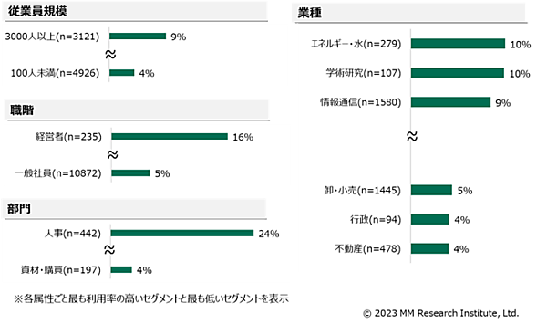 「日本における属性ごとの利用率」を見ると、従業員が多い大手企業ほど、経営層や管理職ほど利用率が高い。業種では、エネルギー・水といったインフラ系、学術研究、情報通信が平均値(7%)より高かった。部門では人事が24%と平均よりもかなり高い結果となった。