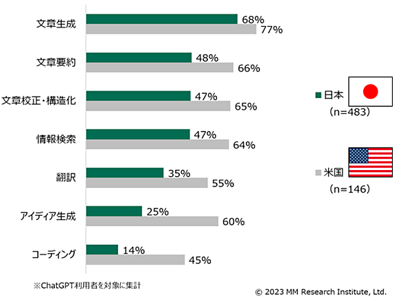 ChatGPTの利用用途では日米とも「文章生成」が最多。「要約」「校正」「検索」「翻訳」はやや下がる。業種や部門に寄らない、事務作業を効率化する用途が目立った。
