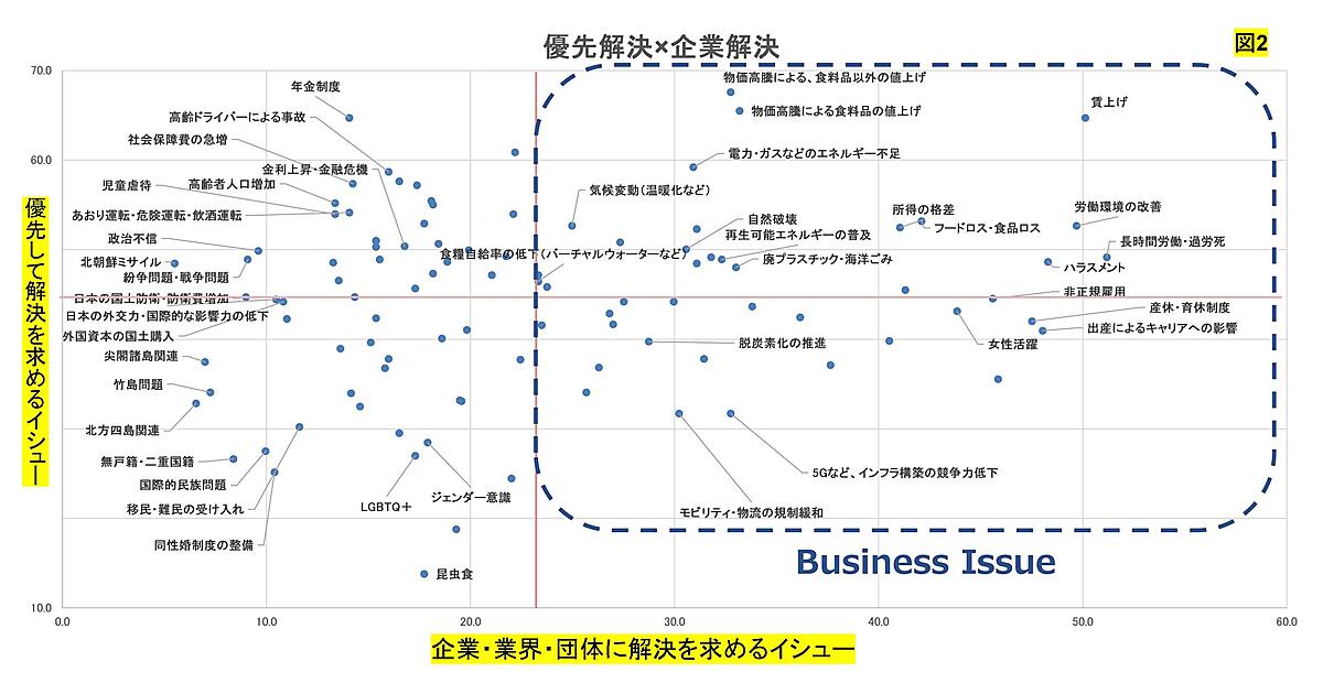 電通PRコンサルティングは、「ソーシャルイシュー100調査」を実施した。主要な社会課題を100項目抽出し、そのイシューにおける生活者の「解決優先度」と企業への「解決期待度」を測定している。
