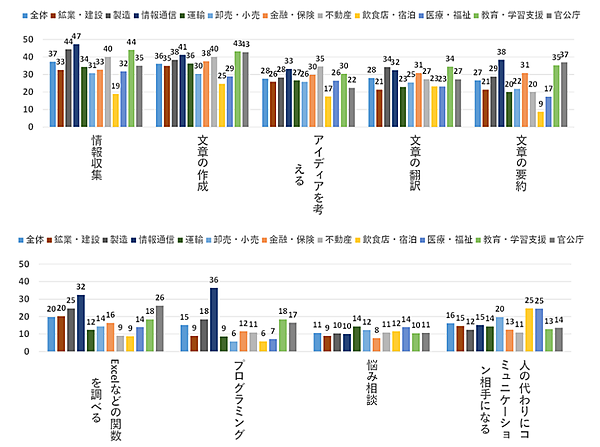 たとえば「業務におけるChatGPTの利用用途」を聞くと、情報通信業では「プログラミング」「Excelなどの関数を調べる」際にChatGPTを利用する人が多い一方、飲食店・宿泊業、医療・福祉業では「人の代わりにコミュニケーション相手になる」が高い傾向が見られた。