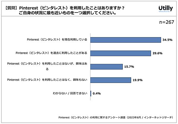 知っていると回答した267人に「Pinterestの利用経験」を聞くと、「現在利用している」34.5%、「過去に利用したことがある」29.6%で、あわせて64.1%が利用経験があった。全体では「現在利用している」は18%程度と算出される。