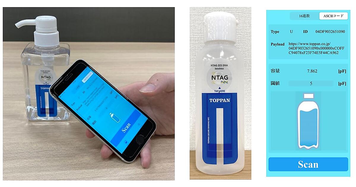 独自のアンテナ設計技術で、NFCタグラベルにNFCアンテナと容器内の液体を検知可能な回路を組み合わせた。専用装置は不要で容器表面に貼り付けたNFCタグラベルをNFCに対応したスマホで読み取り、容器内の静電容量から液体の有無や残量を検知する。ID情報を読み取り、演算による認証情報の取得で商品の真贋判定も可能。表示されたページにキャンペーン情報などのコンテンツを掲載できる。価格は1枚60円から(100万枚製造時)。