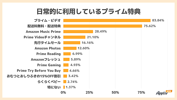 「現在加入している」と回答した730人に「日常的に利用しているプライム特典」を聞くと、最多は「Prime Video(プライム・ビデオ)」83.84%。以下「配送料無料・配送特典」75.62%が続く。3位の「Amazon Music Prime」は28.49%で、上位2つの利用が強い。