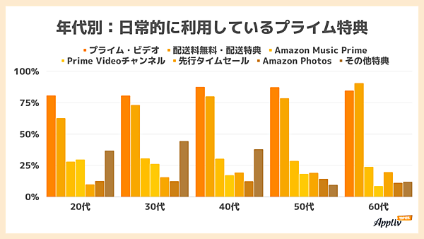 さらに年代別で見ると、「配送料無料・配送特典」の利用率は、60代で90.60%と高いが、下の年代では80%以下、特に20代では62.64%にとどまった。若い世代はAmazonをショッピングサービスではなく、動画配信を中心とした複合型サービスとして活用していることがわかる。