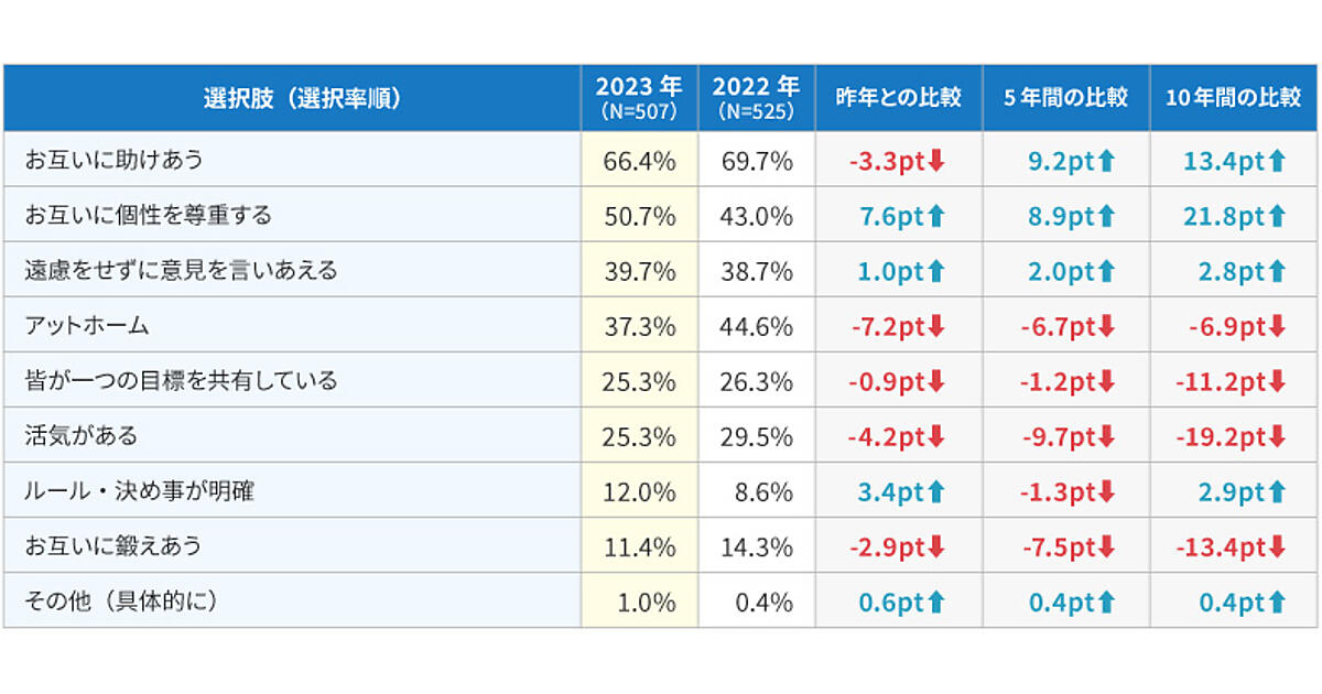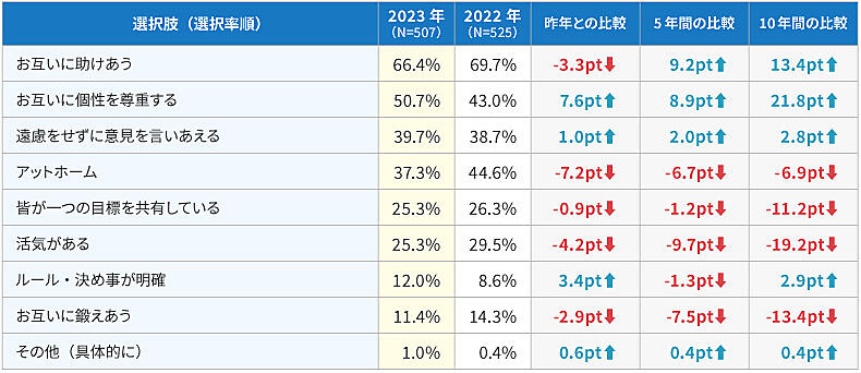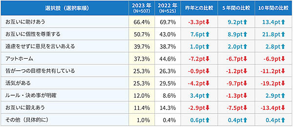 まず「どのような特徴を持つ職場で働きたいですか?」と聞くと、「お互いに助け合う」66.4%が前年に続き最多。「お互いに個性を尊重する」50.7%が過去最高を記録しそれに続いた。「お互いに個性を尊重する」は、10年前と比較すると、21.8ポイントと大幅に増加した。逆に「アットホーム」37.3%、「活気がある」25.3%、「お互いに鍛えあう」11.4%などは前年より減少し、いずれも過去最低を記録している。