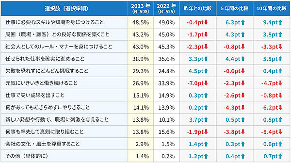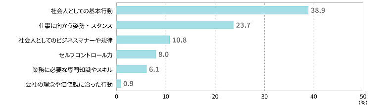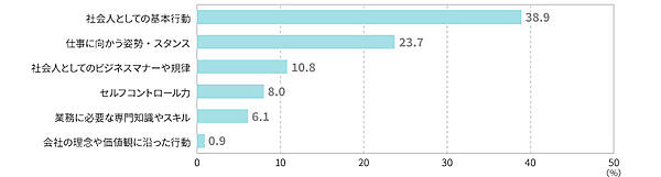 「新入社員時代に身につけるべきこと」を聞くと、「社会人としての基本行動」38.9%で最多。「仕事に向かう姿勢・スタンス」23.7%、「社会人としてのビジネスマナーや規律」10.8%をかなり上回っており、姿勢やマナーより基礎行動のハウツーが重視されていると推察される。