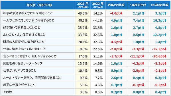 「上司に期待すること」も前年と変わらず「相手の意見や考え方に耳を傾けること」49.5%が最多だった。次いで「1人1人に対してていねいに指導すること」49.1%が2位で、10年前と比べると16.3ポイントと大きく増加し、これも過去最高を記録した。