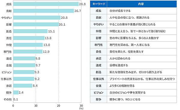 「仕事をするうえで重視したいこと」は、「成長」28.8%と「貢献」26.7%がトップ2。「競争」2.4%が最下位だった。