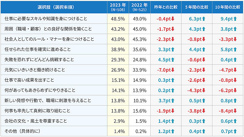 「働くうえで大切にしたいこと」では、「仕事に必要なスキルや知識を身につけること」48.5%が最多。過去最高となったのは「任された仕事を確実に進めること」38.9%、「新しい発想や行動で、職場に刺激を与えること」13.8%、逆に過去最低となったのは「何事も率先して真剣に取り組むこと」13.8%だった。