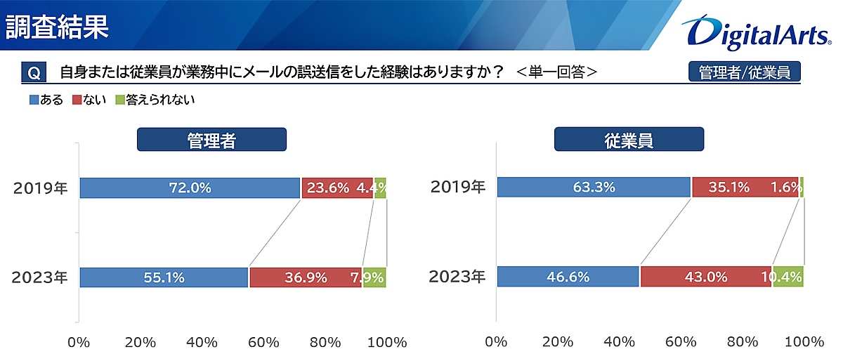 まず「業務中にメールを誤送信した経験」を聞くと、「ある」47.8%。属性別で見ると、情報システム管理者は55.1%、従業員は46.6%が誤送信の経験があった。母数が明らかでないため、原因は不明確だが、基本的に管理者のほうがメール送信機会が多いといった理由が考えられる。2019年の調査結果との比較では、情報システム管理者・従業員ともに誤送信は減少している。