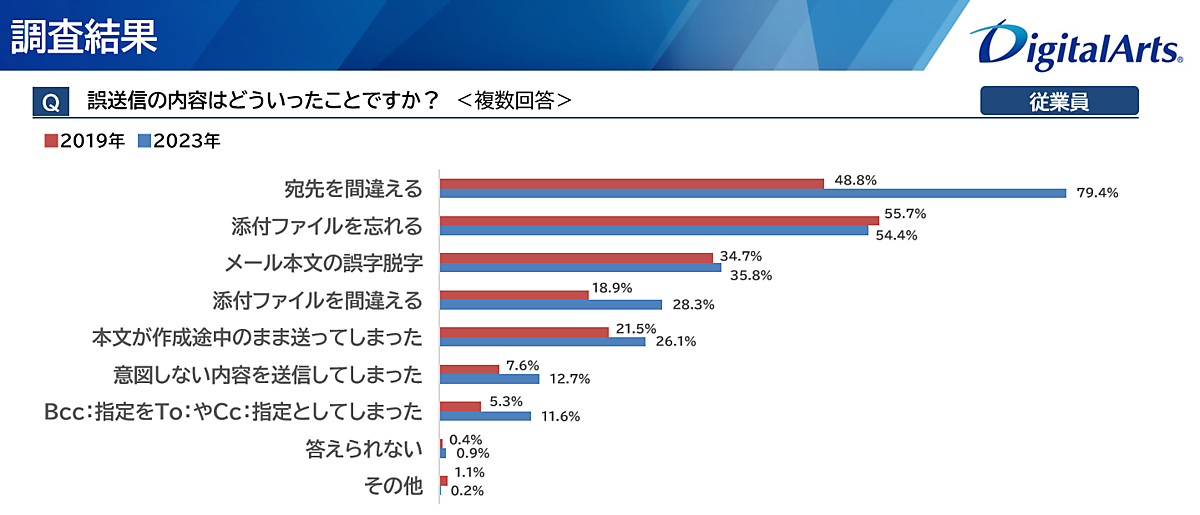 従業員について「誤送信の内容」を2019年の調査結果と比較すると、「宛先を間違える」が大きく増加。その他でも「添付ファイルを間違える」「Bcc:指定をTo:やCc:指定としてしまった」など、情報漏えいに直結するミスの増加が見られた。