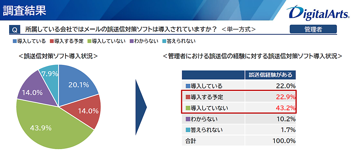なお「誤送信対策ソフトの導入」は、「導入している」20.1%にとどまる。ただし「導入している」管理者でも22.0%が誤送信経験ありと回答している。“誤送信”の内容にも幅があるので留意すべきだろう。