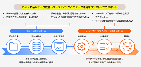 Data DigはCookie(クッキー)レスに対応したデジタルコミュニケーション戦略の推進支援サービス。ユーザーデータの収集・活用の重要度が高まる中、専門人材の不足から効果が上げられなかったり、デジタルマーケティングでCookie(クッキー)規制に伴う代替技術や対策の遅れが目立っていたりすることから、新たにデータ統合支援・活用サービスを提供することにした。