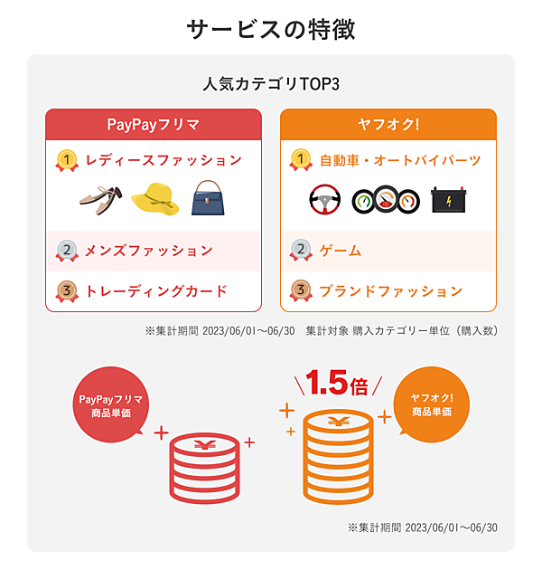 ヤフオク!は1999年9月にサービスを始め、7000万店以上の商品が常時出品される日本最大級のオークションサービスになった。PayPayフリマは2019年10月に開始。スマートフォン決済サービス「PayPay」などとの連携でユーザーを増やしている。ヤフオク!とPayPayフリマでは品ぞろえや商品単価が異なるため、両サービスを利用するユーザーも多いという。