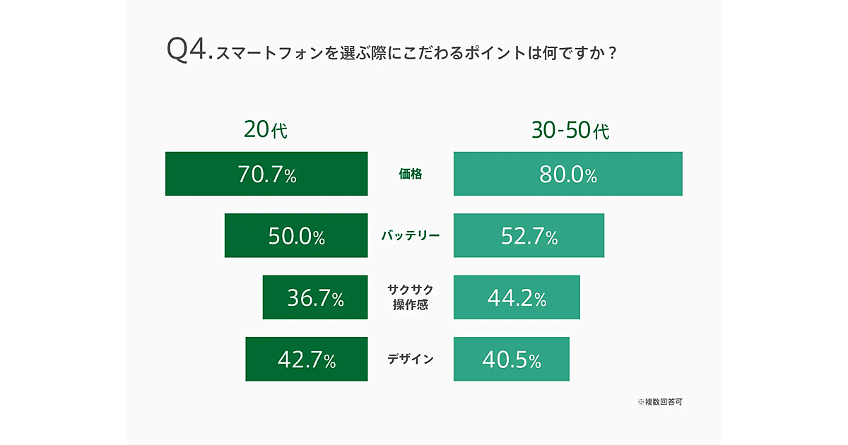 スマートフォンのこだわりについて年代別に見ると、20代・30代~50代のどちらも1位は「価格」、2位は「バッテリー容量」という結果になった。