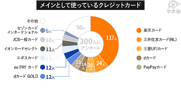 まず「メインカードとして一番利用しているクレジットカード」を聞くと、「楽天カード」「三井住友カード(NL)」「三菱UFJカード」「dカード」「PayPayカード」が上位だった。