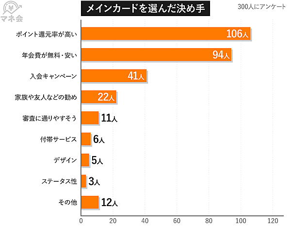 「メインカードを選んだ決め手」では、「ポイント還元率が高い」106人(35%)が最多。「年会費が無料・安い」94人(31%)がそれに続く。