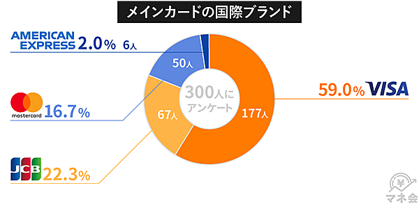 「メインカードの国際ブランド」では「VISA」59.0%が過半数を占めて強さを発揮。「JCB」「Mastercard」「American Express」など著名カード会社がそれに続いた。