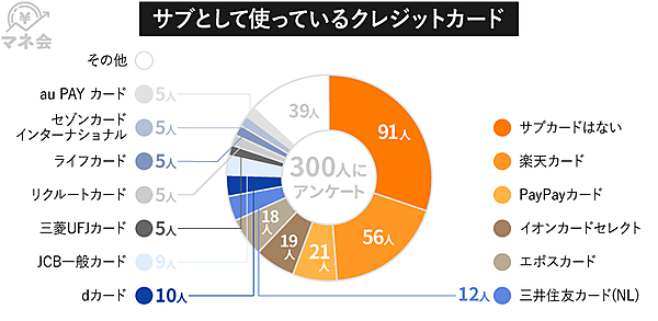 メインカードだけでなくサブカードについても調査したところ、意外にも「サブカードはない」とする人が最多。もっとも人気なのは楽天カードだった。