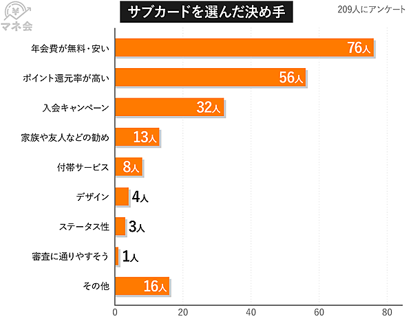 サブカードについても「選んだ決め手」を聞くと、こちらはポイント還元率より「年会費が無料・安い」76人(27.5%)が最多だった。利用頻度が少ない分、ポイント還元率よりも維持費が重視されているようだ。